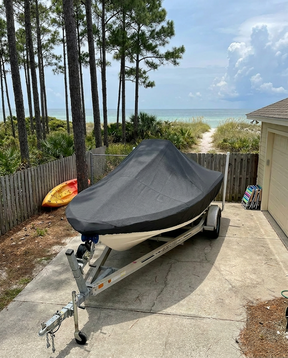 Both polyester options feature solution-dyed construction, where pigment is infused into each fiber during production rather than applied to the surface afterward. This process locks color deep into the material, preventing any dye transfer to your boat’s gel coat or finish. The result is a cover that stays vibrant without bleeding or rubbing off. Our polyester is also designed to breathe — it allows moisture trapped underneath to vent out naturally, reducing the risk of mildew and keeping your boat dry. The fabric holds its form without sagging or stretching over time, stays lightweight enough for one person to handle, and stands up to prolonged UV exposure and harsh marine weather.