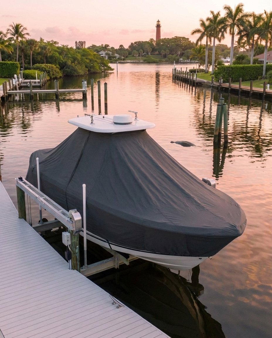 Your 325 Freedom requires a Perfect Fit custom T-Top cover engineered for the 10’9″ beam and AV2® hardtop geometry. Our cover wraps the full hull below the hardtop structure, protecting fishboxes, livewell plumbing, head compartment, berth area, helm electronics, lounge mechanisms, dual swim platforms, and twin-engine assembly from UV exposure, salt spray, and moisture. Solution-dyed marine fabric (5–7 years) or premium Sunbrella acrylic (8–10 years) preserves your flagship investment through seasons of offshore fishing, family cruising, or marina storage.