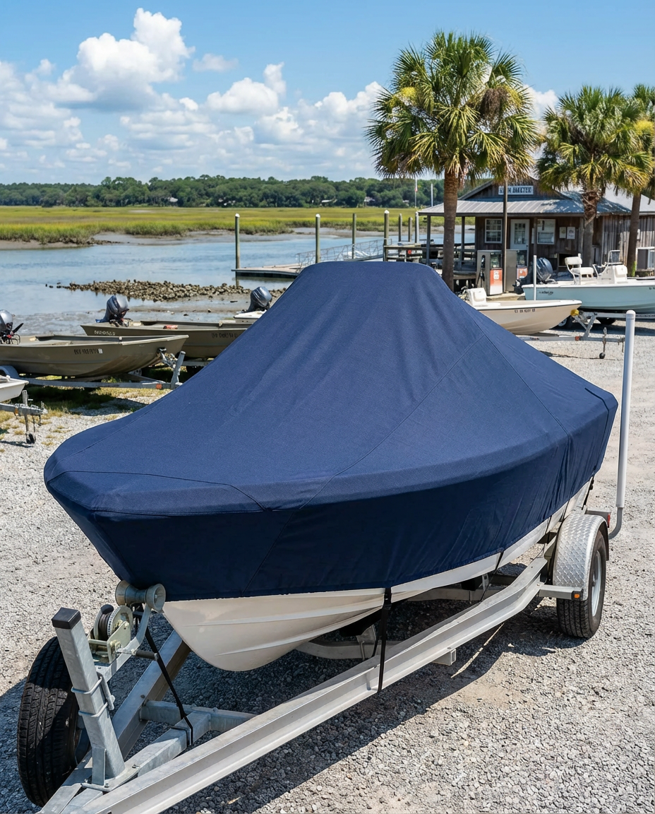 Both polyester options feature solution-dyed construction, where pigment is infused into each fiber during production rather than applied to the surface afterward. This process locks color deep into the material, preventing any dye transfer to your boat’s gel coat or finish. The result is a cover that stays vibrant without bleeding or rubbing off. Our polyester is also designed to breathe — it allows moisture trapped underneath to vent out naturally, reducing the risk of mildew and keeping your boat dry. The fabric holds its form without sagging or stretching over time, stays lightweight enough for one person to handle, and stands up to prolonged UV exposure and harsh marine weather.