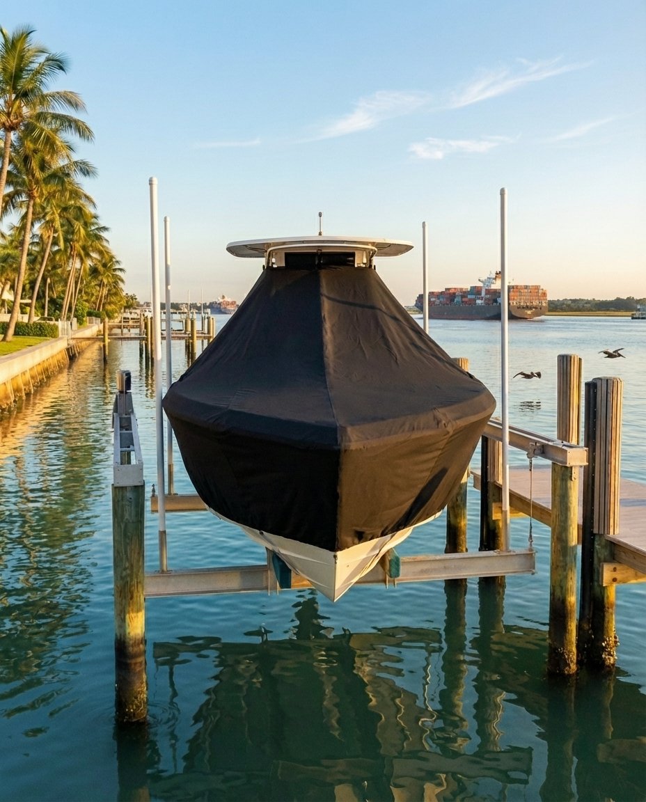 Every polyester cover we sell is made from solution-dyed fiber. During the manufacturing process, pigment is added to the raw polyester before it becomes a solid strand, which means color penetrates the full cross-section of each fiber rather than sitting on the surface. The result is a fabric that will not transfer color onto gel coat or rub off during normal use. Our polyester is also engineered to be highly breathable, resisting mildew buildup while allowing trapped moisture to escape. It holds its shape without stretching, keeps its weight down for easy handling, and maintains its appearance over years of sun and weather exposure.