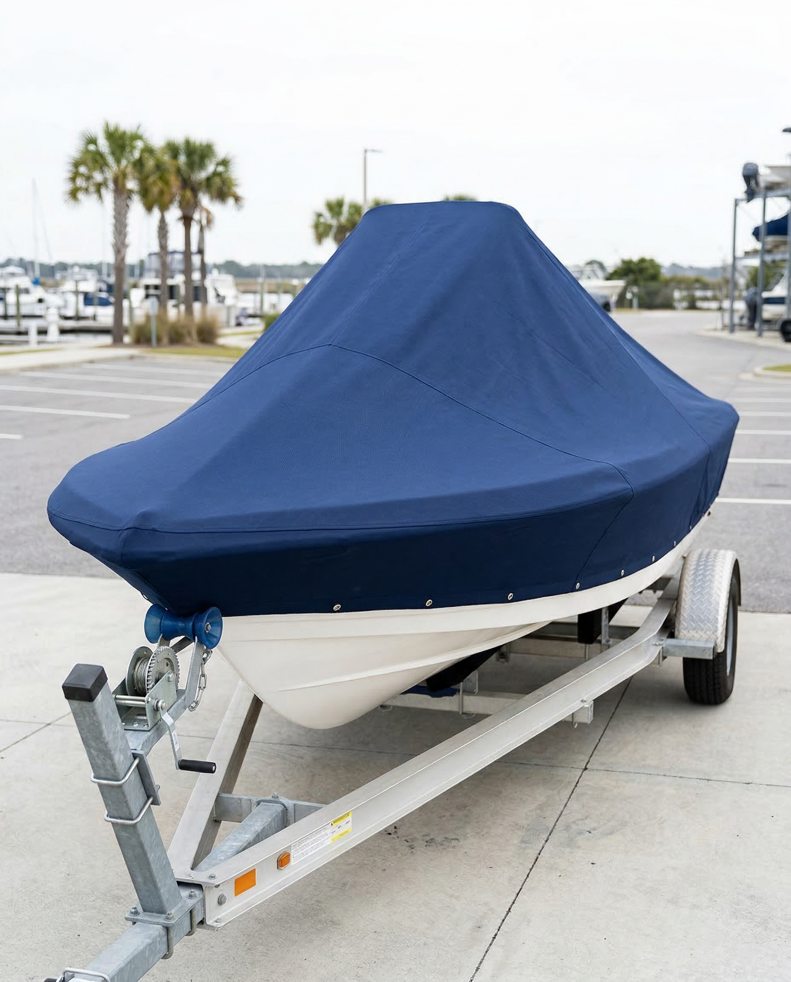 Both polyester options feature solution-dyed construction, where pigment is infused into each fiber during production rather than applied to the surface afterward. This process locks color deep into the material, preventing any dye transfer to your boat’s gel coat or finish. The result is a cover that stays vibrant without bleeding or rubbing off. Our polyester is also designed to breathe — it allows moisture trapped underneath to vent out naturally, reducing the risk of mildew and keeping your boat dry. The fabric holds its form without sagging or stretching over time, stays lightweight enough for one person to handle, and stands up to prolonged UV exposure and harsh marine weather.
