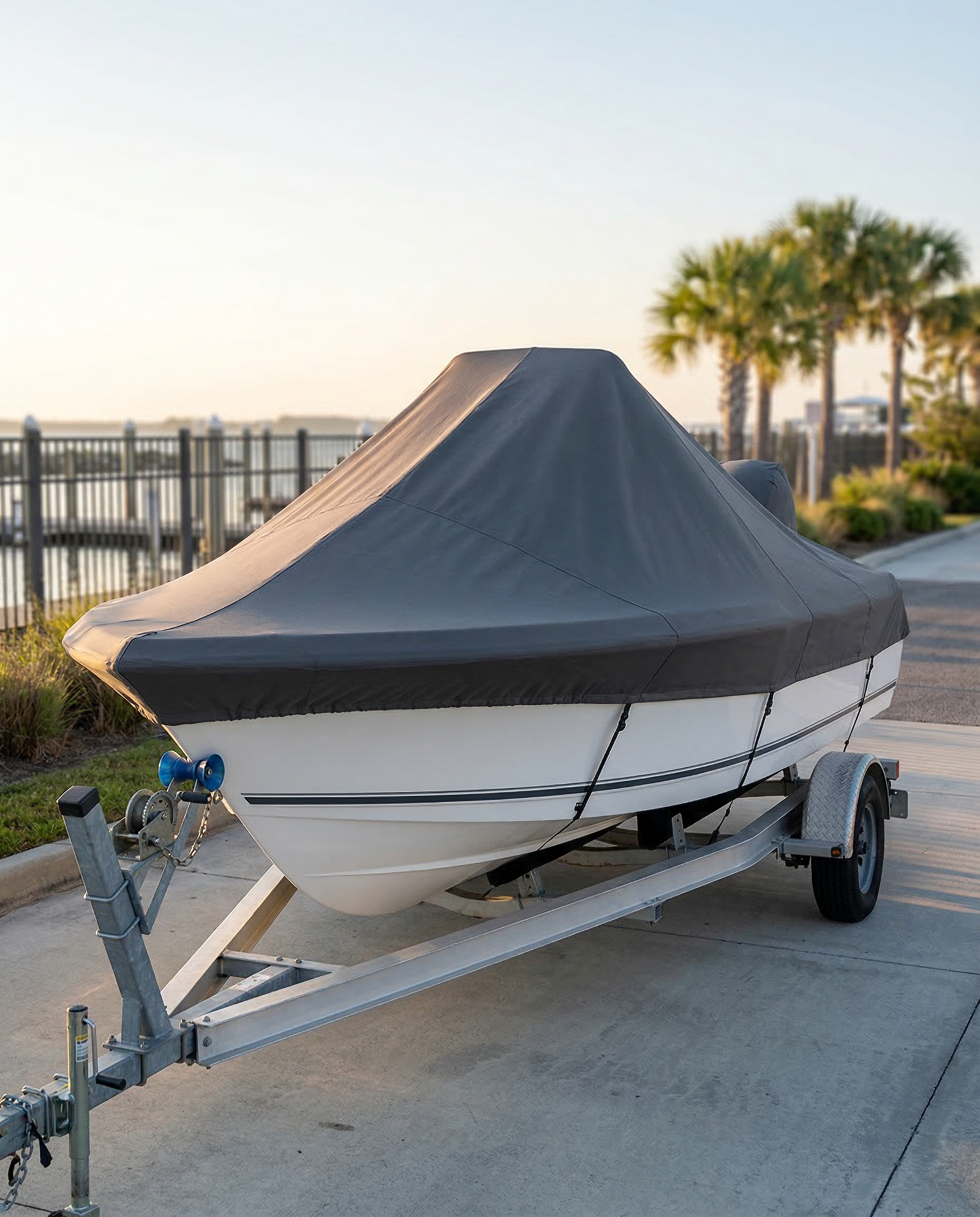 Absolutely. The cover is built with reinforced stitching at every high-stress point — bow eye, console base, and cleat locations — specifically to handle highway wind loads. The stainless steel snaps and adjustable hem cord keep it locked down tight against the rubrail. Many Sea Hunt 177 owners trailer regularly with our cover in place without any issues.