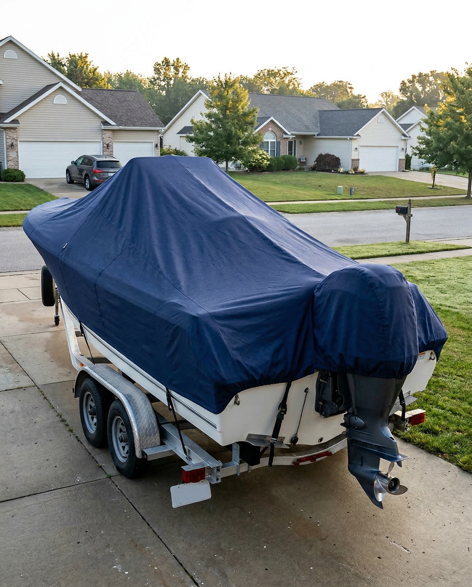 Absolutely. The cover is reinforced at every high-stress point — bow eye, console base, cleats, and transom corners — specifically for trailering. The stainless steel snaps and adjustable hem cord lock the fabric tight against the rubrail so it won't flap or lift at speed. Many 196 CC owners trailer regularly with our cover in place without any issues.