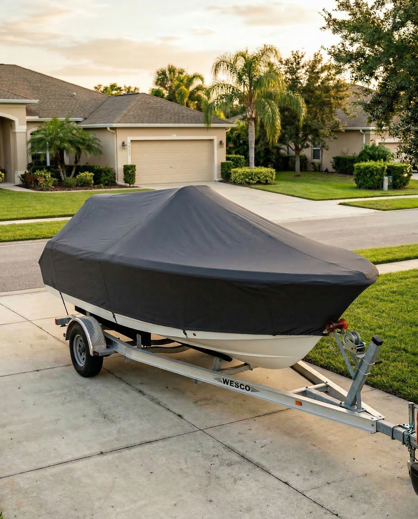 We offer two primary options: 9 oz solution-dyed polyester and Sunbrella acrylic. The 9 oz polyester is our most popular choice — heavy enough to resist tearing and abrasion, breathable enough to prevent trapped moisture and mildew, and the solution-dyed process locks color into each fiber so it will not fade or transfer to your gelcoat. Sunbrella offers the highest UV resistance and color retention available, ideal for boats stored in direct sunlight year-round or in harsh saltwater environments. Both fabrics are treated with water-repellent and mildew-resistant finishes.
