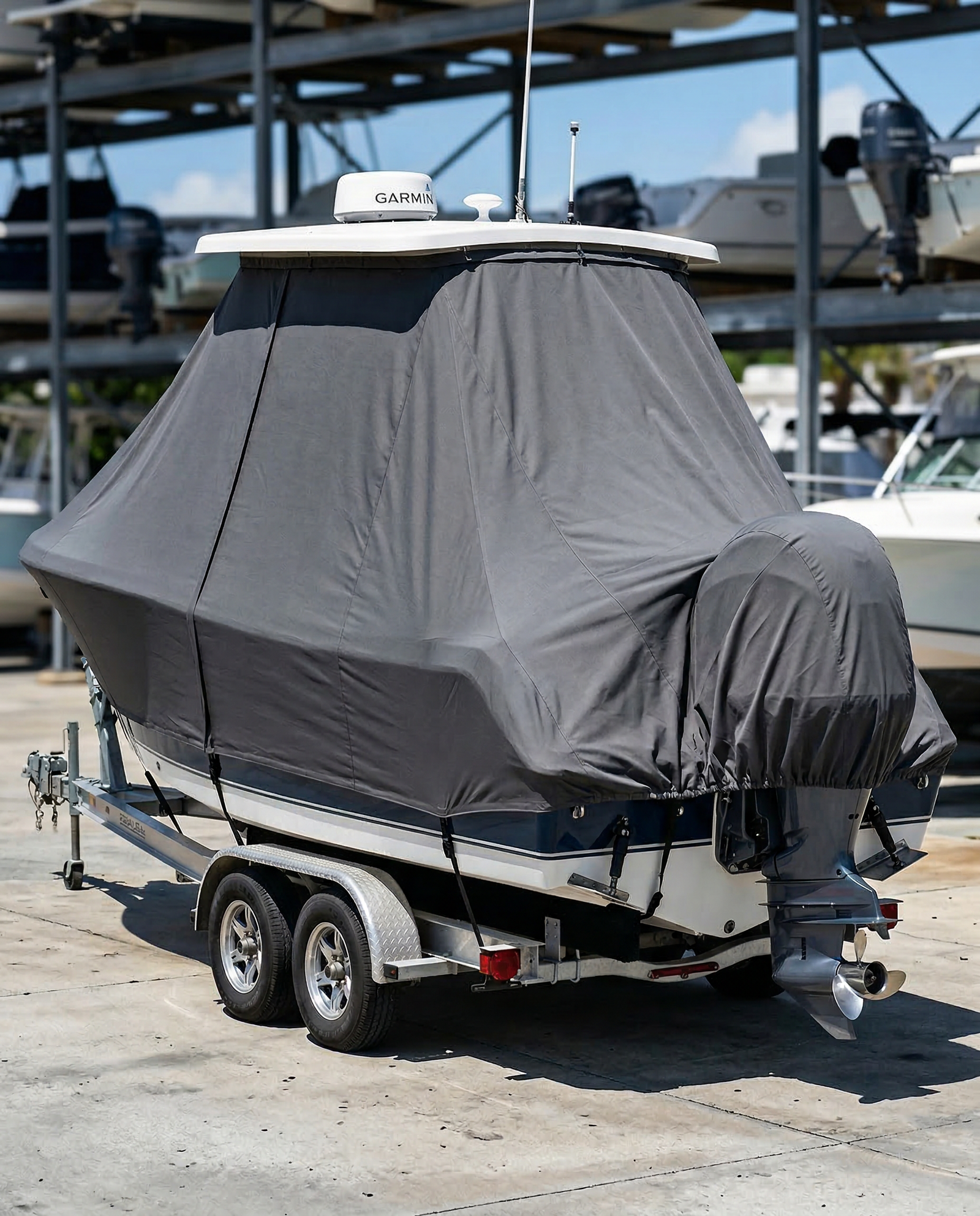 Yes. The cover is designed for both mooring and trailering. The multi-point tie-down system anchors the cover's bottom perimeter to your trailer frame at multiple secure points, keeping the fabric taut and preventing wind-induced flapping at highway speeds. The 229 Ultra's 2,600 lb dry weight makes it a common trailering boat, and the wide 8'6" beam means proper anchoring is essential — our tie-down straps are engineered with corrosion-resistant hardware for exactly this purpose.