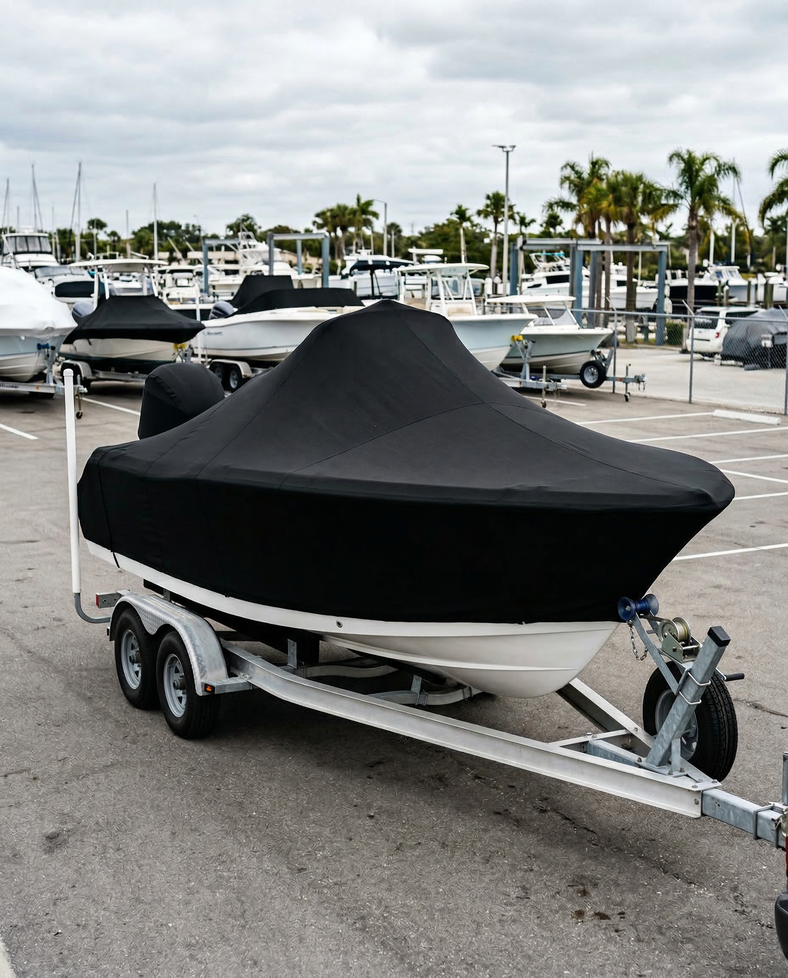 This is a mooring cover, built for stationary protection at the dock, on a lift, or parked on a trailer in the driveway. The snaps, straps, and hem cord hold the cover firmly in place while the boat is stationary, but trailering at highway speeds generates wind loads that exceed what a mooring cover is designed to handle. If you tow your 234 Escape regularly, contact us about our trailering cover, which uses additional reinforcement and a tighter fit profile built for road speeds.