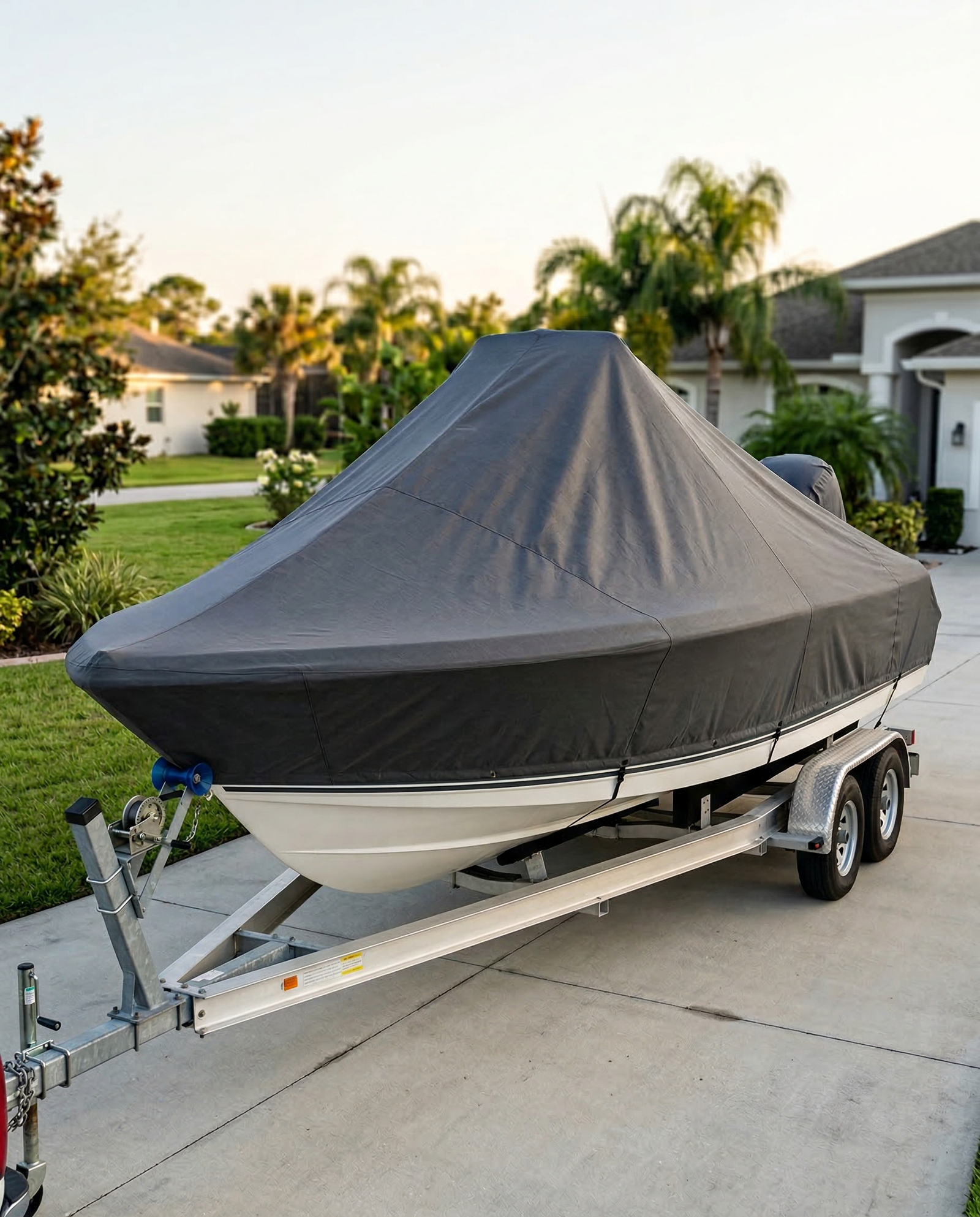 Yes — this cover is ideal for trailer storage in the driveway, on a lift, or at a dock. The snaps, straps, and hem cord hold the cover securely in place while the boat is stationary. However, this is a mooring cover, not a trailering cover. Towing at highway speeds generates wind loads that can stress the fabric and hardware beyond their design limits. If you regularly tow your 234 Ultra with the cover on, contact us about our trailering cover option, which uses additional reinforcement and a tighter fit profile designed for road speeds.
