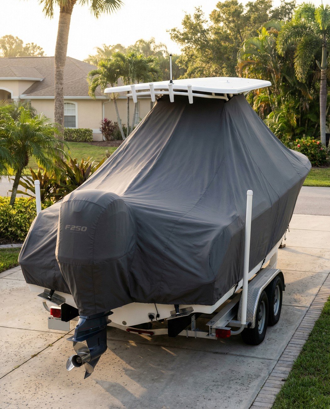 Yes. The cover wraps the stern and engine area as one continuous fabric piece, creating a smooth contour around the Yamaha F250 cowling. The 250HP engine is the standard powerplant for the 234 Ultra, and our pattern accounts for this installation — no separate engine boot or detachable section is needed. The cowling, lower unit, and all rigging are fully protected from UV, rain, salt spray, and debris.