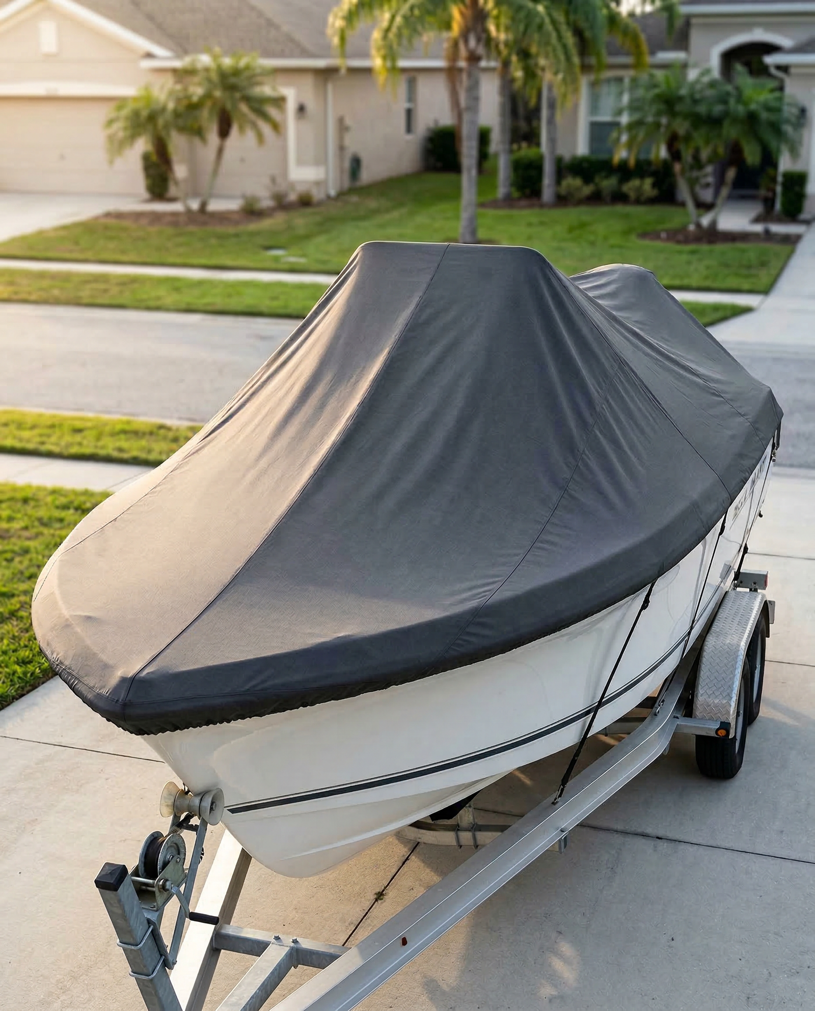 This cover is ideal for stationary trailer storage in the driveway, on a lift, or at a dock. The snaps, straps, and hem cord hold the cover firmly in place while the boat is parked. However, this is a mooring cover — not a trailering cover. Towing at highway speeds generates wind loads that can stress the fabric and hardware beyond their design limits. If you tow your 235 Escape regularly with the cover installed, contact us about our trailering cover option, which features additional reinforcement and a tighter fit profile built for road speeds.