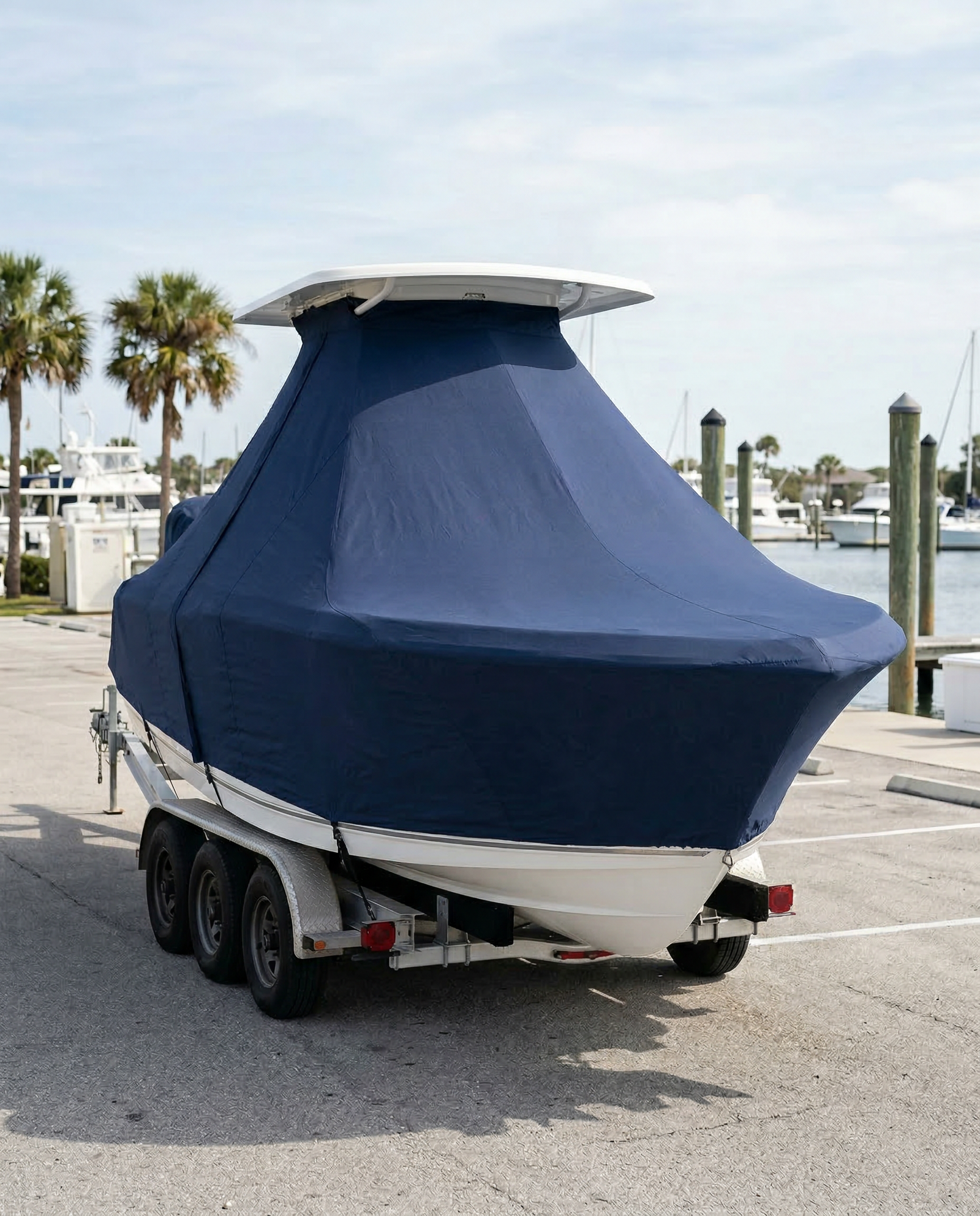 A full fuel load adds roughly 1,080 pounds and a full freshwater tank adds about 158 pounds, bringing the total well above 5,700 pounds dry. This changes tongue weight but does not affect cover fit because the cover attaches to the T-top frame above and trailer frame below, independent of hull weight. The extra weight actually stabilizes the trailer stance and reduces rocking in wind. We recommend keeping the boat level on the bunks regardless of fluid levels for the most even cover drape.