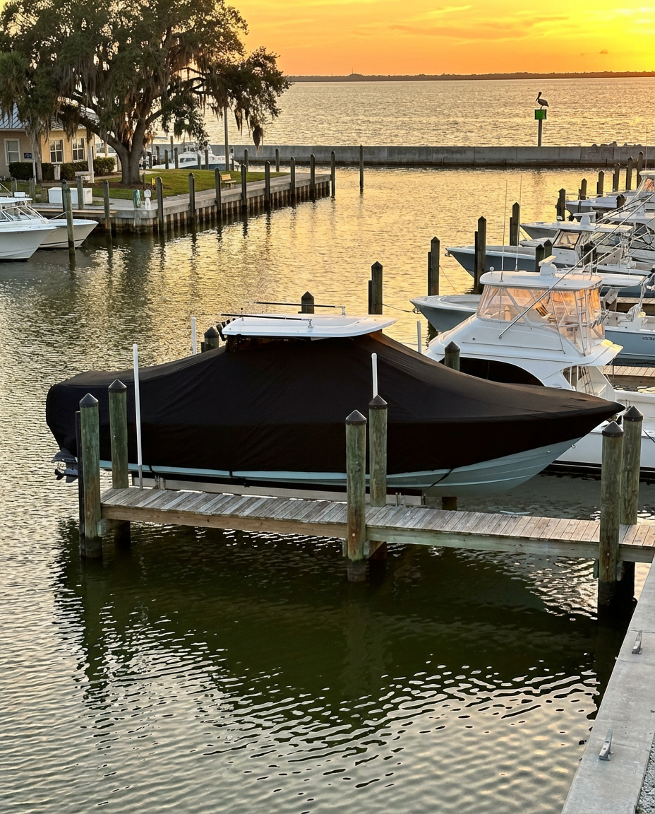 7 oz. Polyester — Our entry-level marine cover fabric, woven from 100% polyester fiber at a 7 oz. per linear yard weight. This lighter option keeps the cover manageable for solo handling while still delivering reliable protection against sun, rain, and debris. Backed by a 3-year fabric warranty. Ships in Black.